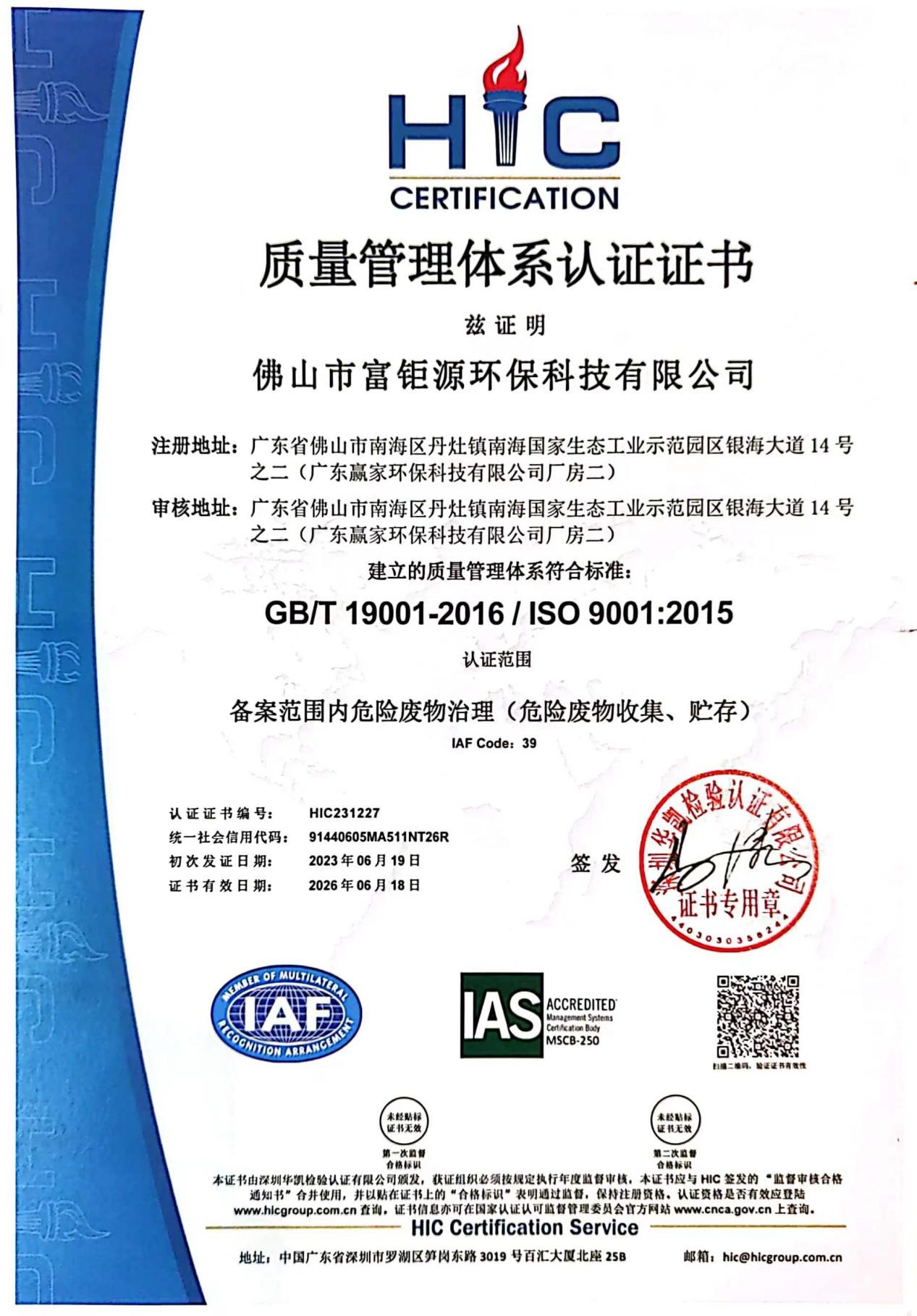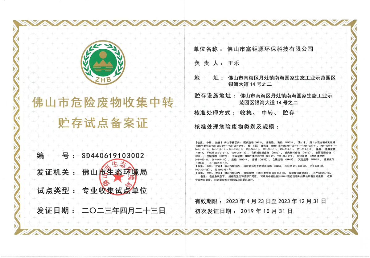 佛山市富鉅源環(huán)??萍加邢薰境闪⒂?017年11月,是佛山市最早一批獲得危險廢物收集試點備案證的企業(yè)。公司積極響應(yīng)佛山市“無廢城市建設(shè)”號召,致力于為佛山市中小微產(chǎn)廢量企業(yè)做好危險廢物專業(yè)化的收集轉(zhuǎn)運工作,為城市環(huán)保安全保駕護(hù)航。